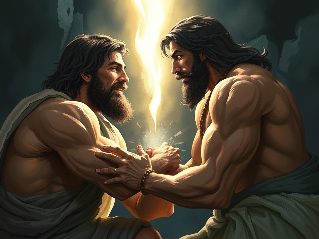 That night, Jacob crossed the Jabbok, where Jacob is found alone that night. During the night a man wrestles with Jacob until the morning. When the man did not win, he put Jacob’s hip out of socket. Jacob still will not let the man go until he blesses Jacob. Then the man tells Jacob his name from then on is Israel because “You have striven with God and with men and prevailed” (Genesis 32:28). Jacob called the place Peniel “For I have seen God face to face, and yet my life has been delivered.”